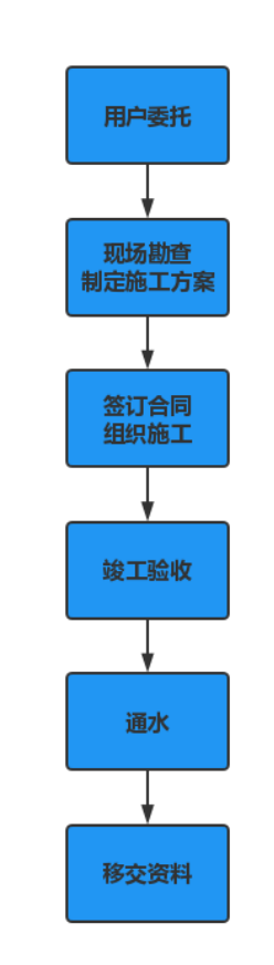 二、用戶委托---建設(shè)工程有限公司現(xiàn)場踏勘---供水施工方案---簽訂合同---建設(shè)工程有限公司組織安全文明施工---竣工第三方驗(yàn)收---通水---移交(供水設(shè)施及技術(shù)檔案)