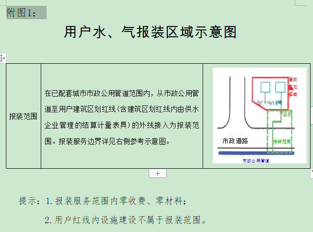 在已配套城市市政公用管道范圍內(nèi),從市政公用管道至用戶建筑區(qū)劃紅線的外線接入為報裝范圍。供水、供氣企業(yè)的投資界面必須延伸至用戶建筑區(qū)劃紅線,紅線外連接工程由供水、供氣企業(yè)負責,用戶“零成本”不需要投資。施工結束后,供水、供氣企業(yè)按指定標準恢復市政道路和園林綠化。